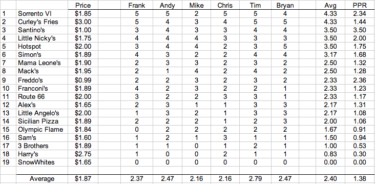 Every year, our group of four (or five!) spends one entire evening tasting and rating a slice of pizza from every ”legitimate” pizza place on the Wildwood, NJ boardwalk. Here, we reveal our findings… For more info, read the ‘About the Pizza Tour‘ page!